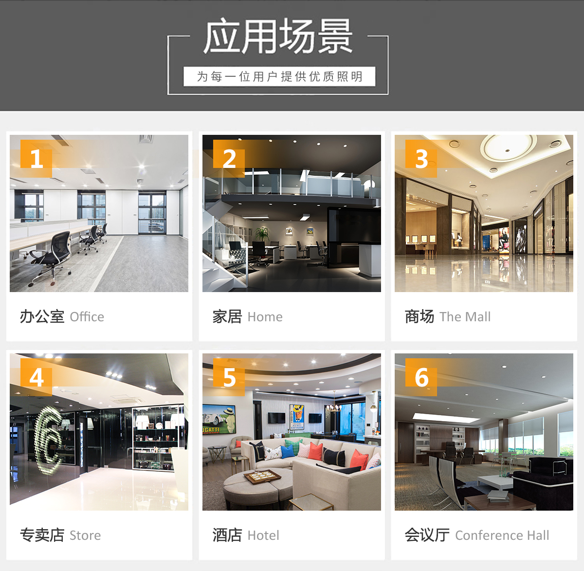 LED筒燈是一種嵌入到天花板內(nèi)光線下射式的照明燈具,光束角屬于廣角度,光線較分散均勻。LED筒燈不占據(jù)室內(nèi)空間,在室內(nèi)安裝LED筒燈,因為燈具的隱密性,不會使用產(chǎn)生壓迫的感覺,相反地會產(chǎn)生溫馨的效果。 旅館、酒店、賓館的照明運(yùn)用LED筒燈等產(chǎn)品,給顧客帶來一種不一樣的感受,除了節(jié)約能源之外,還能盡顯豪華和溫馨。 起居室和家庭影院照明,利用LED筒燈的燈光色彩來烘托一種溫暖、和諧的情調(diào),體現(xiàn)舒適、休閑的氛圍。 博物館、美術(shù)陳列館等場所屬于對照明環(huán)境要求較高的特殊場合,其展示物品的特殊性要求照明光源不含紫外線,沒有熱輻射。LED筒燈是冷光源,光線中不含紫外線,完全可以滿足博物館、美術(shù)陳列館對照明的特殊要求。 會議室、多功能廳照明可以依據(jù)會議內(nèi)容的不同調(diào)整會議室或多功能廳的照明環(huán)境,嚴(yán)肅或是活潑可以自由設(shè)定,LED筒燈可以滿足不同會議主題對光環(huán)境的需求。 專賣店、商場等室內(nèi)商業(yè)氣氛照明,LED筒燈很適合烘托專賣店和商場的氣氛,LED光源能營造出其他傳統(tǒng)照明電光源所無法比擬的高品質(zhì)光環(huán)境。 其它室內(nèi)照明場所。